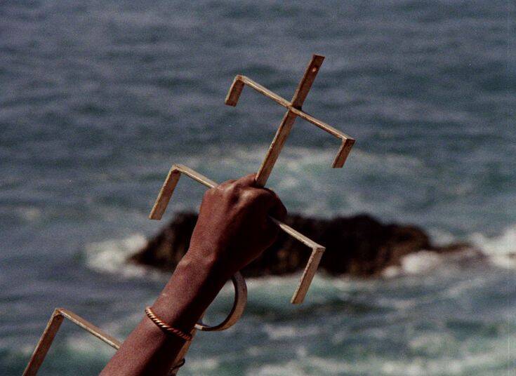 The sounds of the vultures are intermixed with those of the lady’s laughter, reverberating into the air like a hyena’s cry. We are given one more shot of the calf being slaughtered by the two men. But this time it is limp and no longer moving or kicking to stay alive. The scene cuts to the bottom of the cliff where the ocean waves are crashing into the rocks. We cut back to Anta facing a wall of rock with her back turned towards the camera. Her face is hidden, we can only assume given her body language that she might be crying over the loss of something or someone. The shot cuts back to the sea waves crashing onto the shore. There is no sign of Mory’s body down at the bottom of the cliff. The only thing there are the back-and-forth undulations of the waves. Even though this scene is filled with ambiguity we can be certain of its visceral and audio-visual effect – it provokes an uneasiness that is tied to Mory, reiterating what was established in the beginning with the slaughterhouse. What we might assume is that something did die in this scene, something more than just the calf. And it is clear that the fate of the slaughtered calf, or whatever visual metaphor Mambéty wants to portray, bears an identical oneness with Mory - it is Mory in some shape or form.